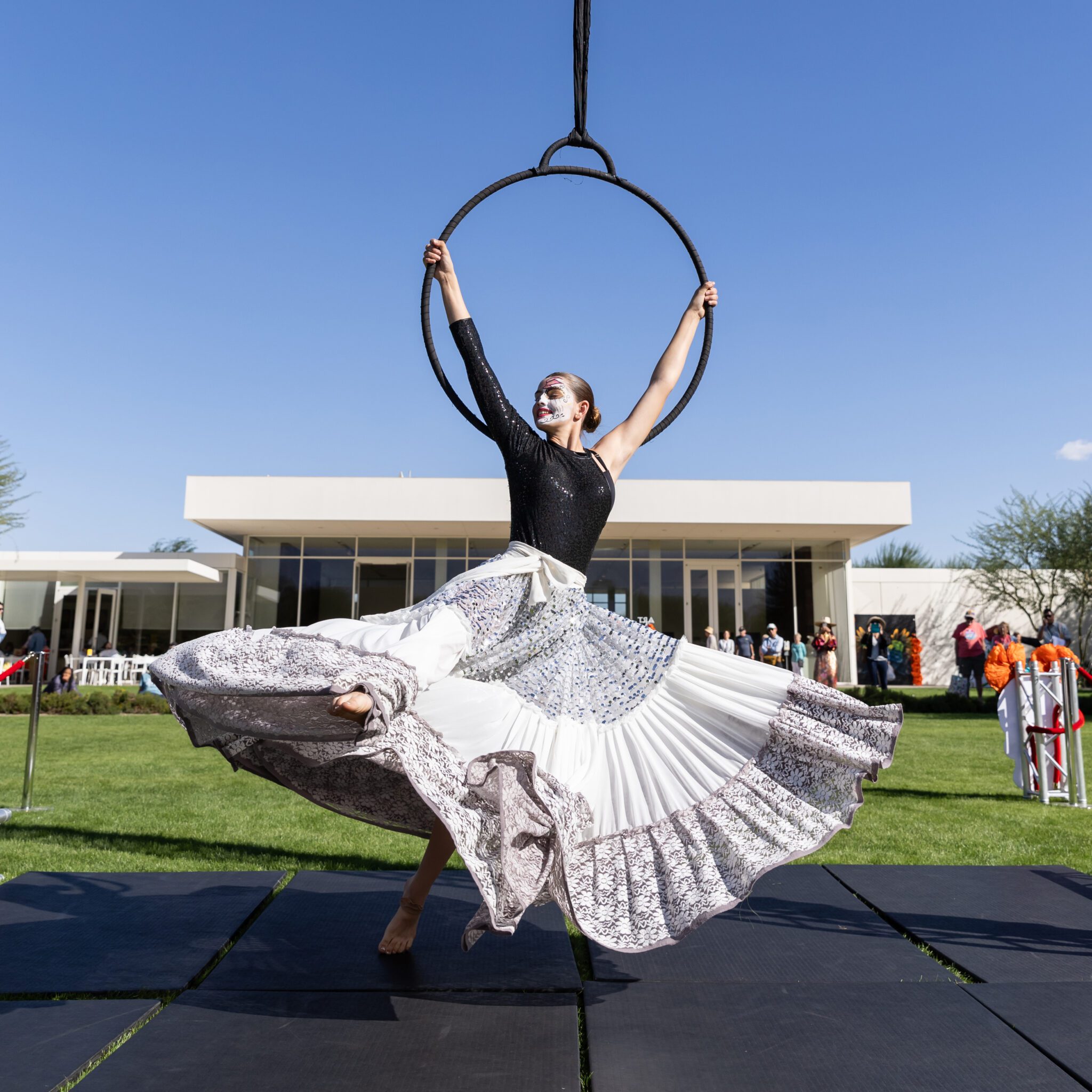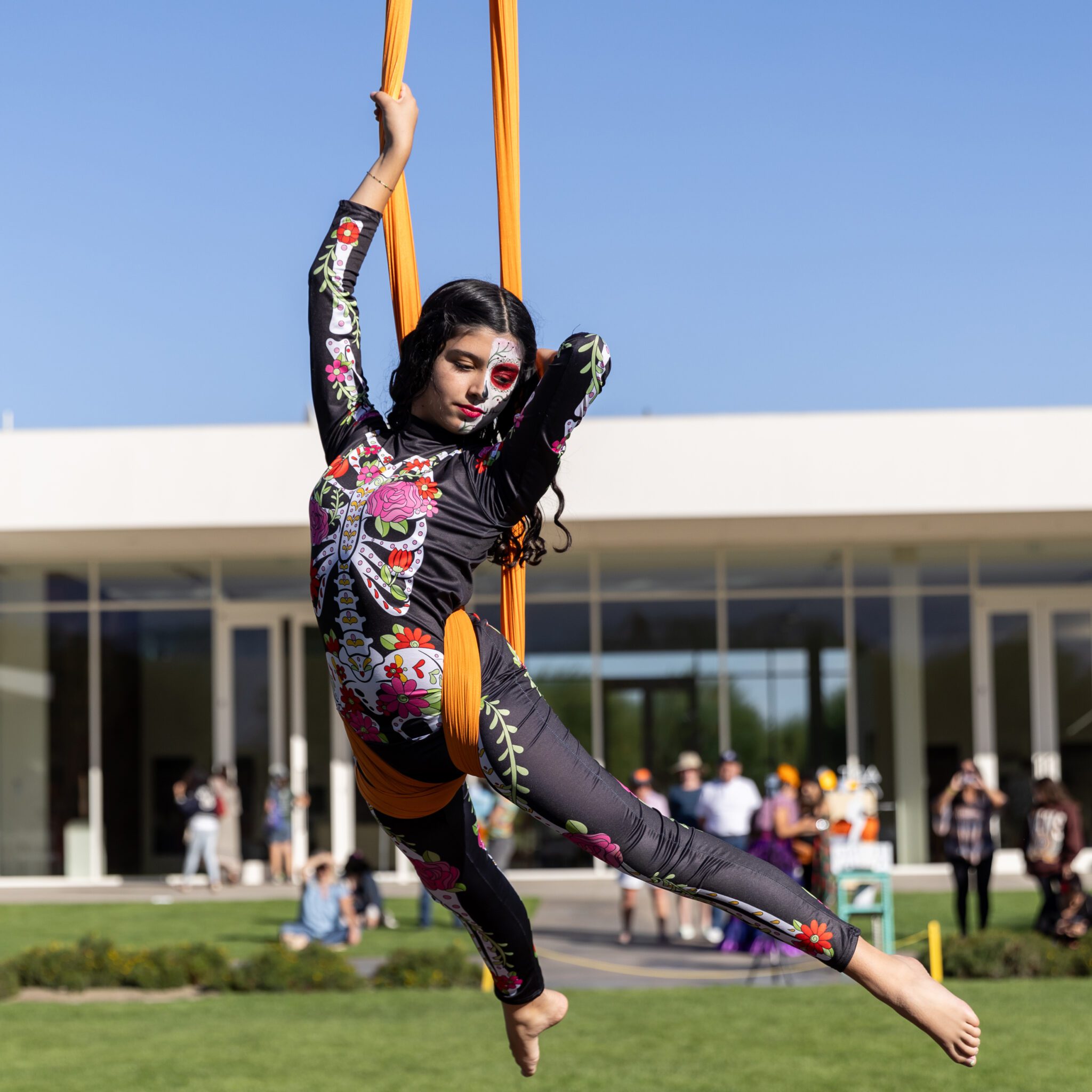 Join Art Flying Aerial in celebrating the vibrant culture and rich traditions of Hispanic heritage with a Day of the Dead-themed aerial performance. Featuring creative backgrounds, costumes, and performances by local students, it’s a sight you won’t want to miss.